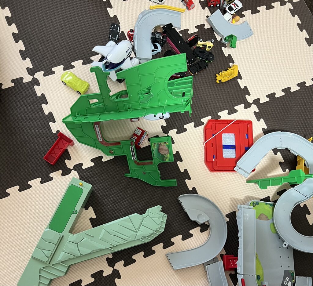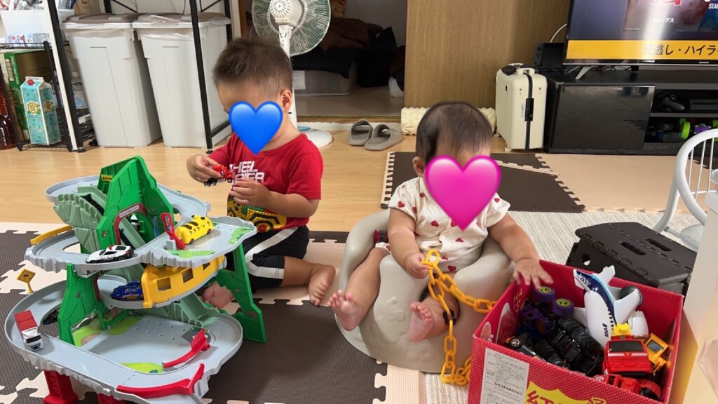 (例)家事は午前中に終わらせる!この時間は子どもと遊ぶ。など - 同時に遊べる工夫:2人で楽しめる遊びを選ぶ。上の子は車あそびが好きなのですが、下の子にもおもちゃを渡して一緒に遊んでもらってます(笑)